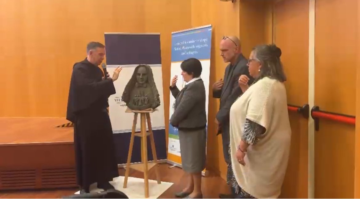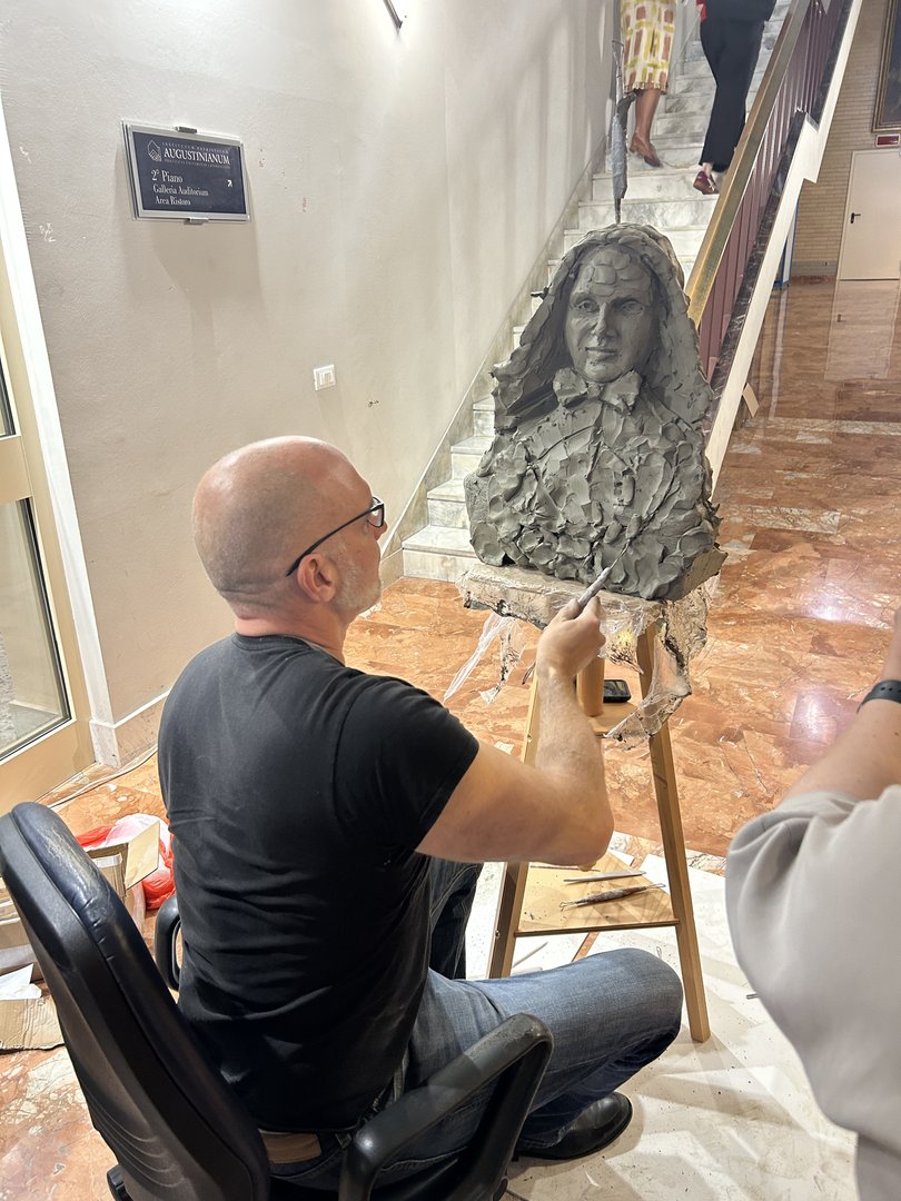 Durante los tres días que duraron los encuentros, el escultor Timothy Paul Schmalz, autor de Angels Unawares en la plaza de San Pedro, se dedicó a la creación de un busto de Madre Cabrini.