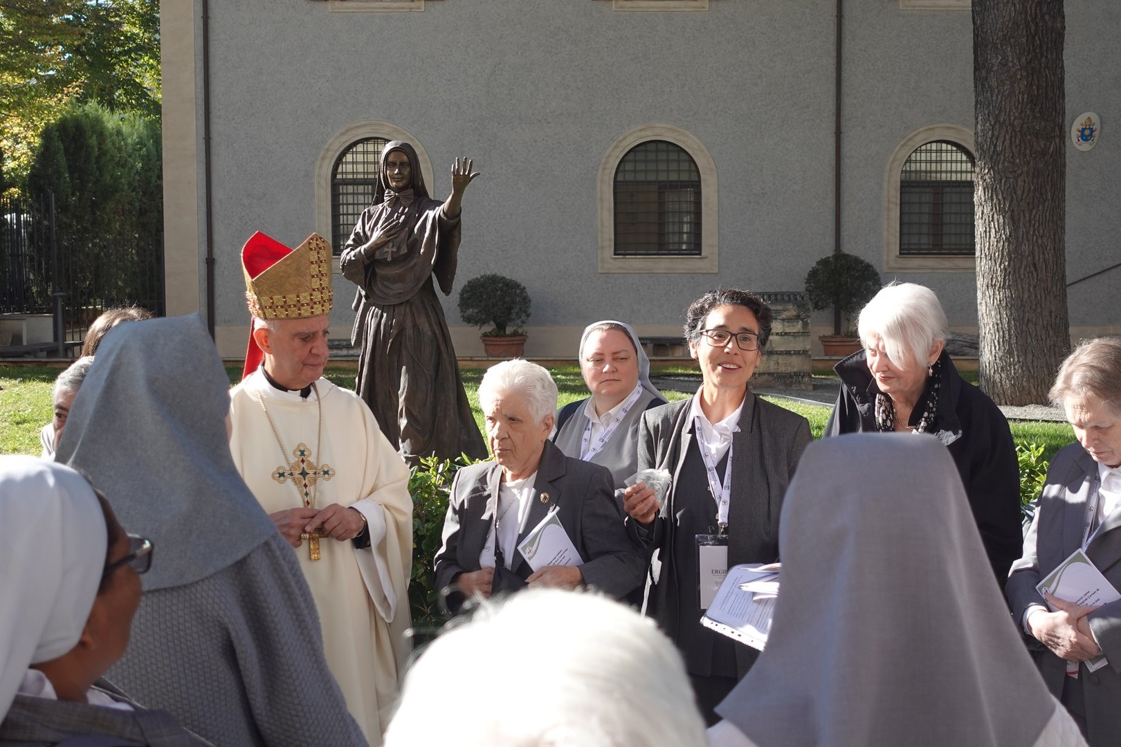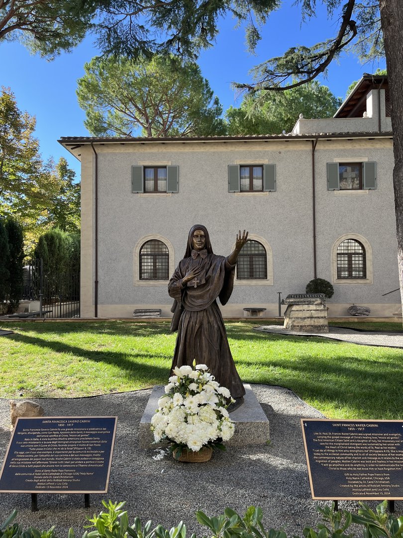 Tras la celebración, las hermanas se dirigieron en una pequeña procesión desde la Basílica hasta el jardín donde se encuentra la estatua; allí se rindió homenaje con flores blancas a la Madre Cabrini y a continuación se recitó una oración. Posteriormente, se tomaron varias fotos alrededor de la representación escultórica de nuestra santa fundadora y se entregaron rosas rojas a la señora Carol Christiansen, acompañada por la señora MaryAnn Miskieqicz. La señora Christiansen, benefactora también de la estatua gemela que se encuentra en el exterior de la Catedral del Santo Nombre de Chicago y que por motivos de salud no pudo asistir a la inauguración de la estatua el pasado mes de noviembre, participó con gusto en la celebración y en la oración dedicada a Santa Cabrini.