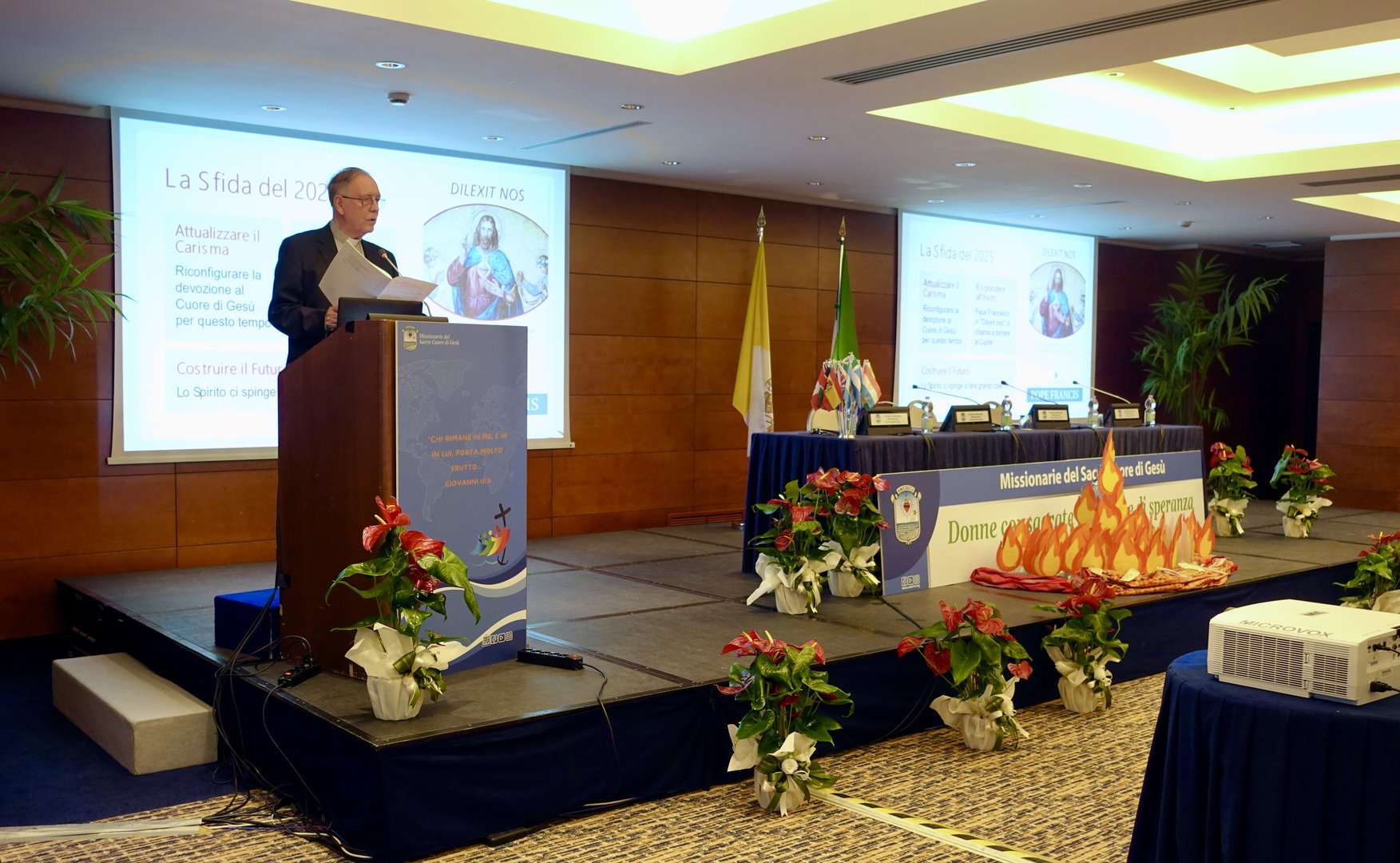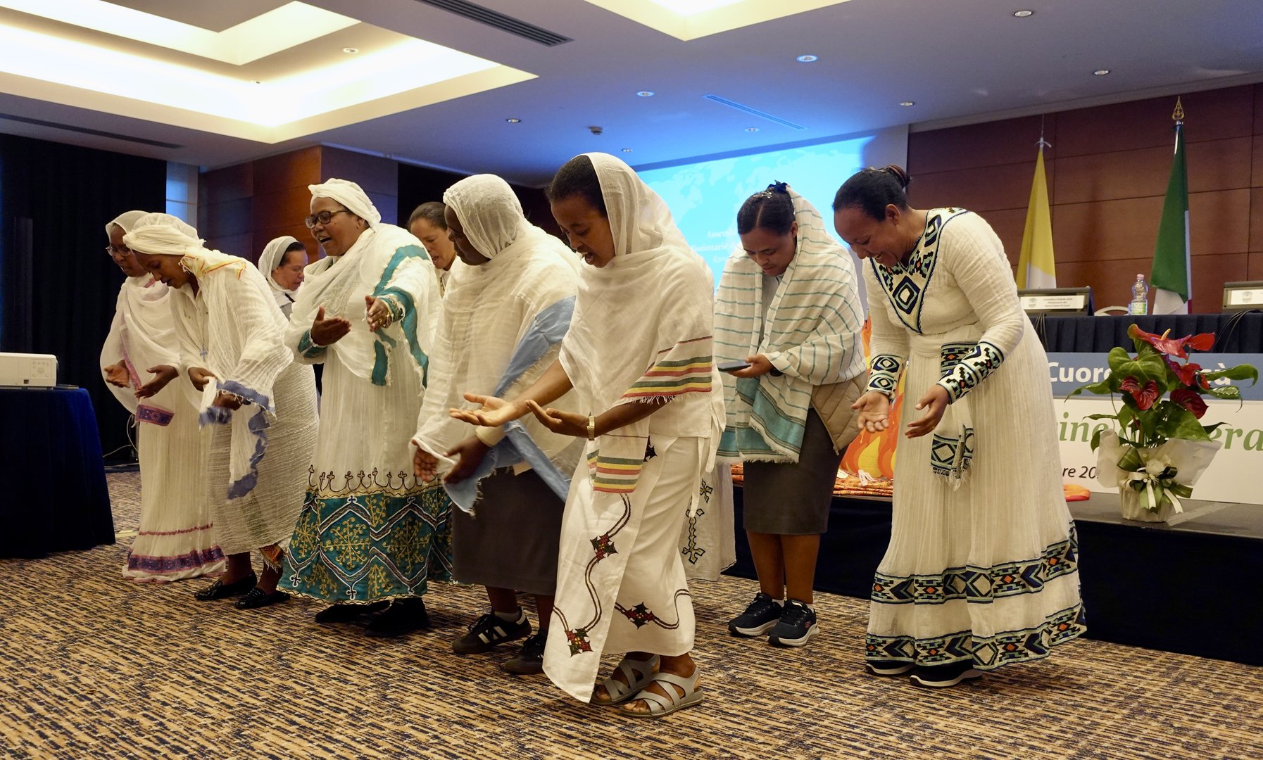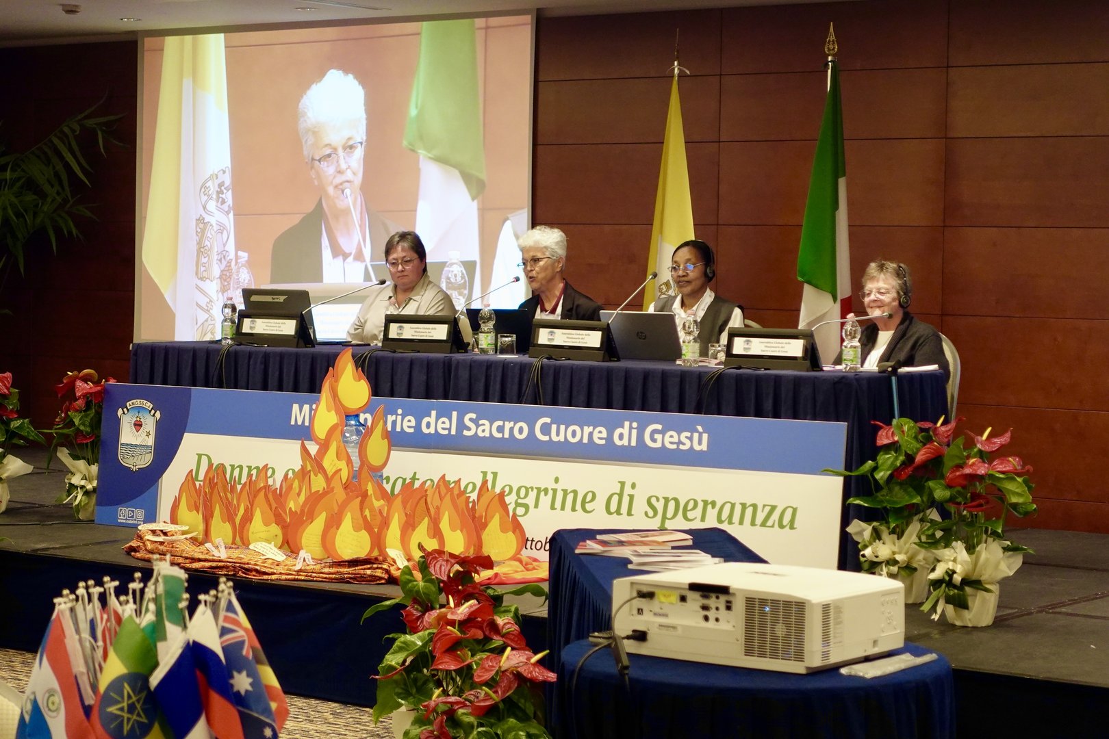 Oggi secondo giorno dell’Assemblea Globale delle Missionarie del Sacro Cuore di Gesù dal titolo "Donne Consacrate Pellegrine di Speranza" presso l'hotel Ergife a Roma. Dopo la preghiera del mattino si è tenuta la conferenza dal titolo "La spiritualità del Sacro Cuore di Gesù" di Padre Josè Cristo Rey Garcìa Paredes, CMF, Congregazione dei missionari figli del Cuore Immacolato di Maria. Successivamente, si è svolta la tavola rotonda dal titolo "L'espressione della spiritualità del Sacro Cuore di Gesù e della missione oggi" dove quattro suore hanno condiviso la declinazione di questa espressione ciascuna nella propria Provincia e Regione. Così Sr. Tatiana ha parlato del quadro che è stato realizzato pochi mesi fa sul Sacro Cuore da una pittrice russa e della missione in Russia, Sr. Gloria della sua esperienza in Brasile,  Sr. Alemenesh di quella in Etiopia e Sr. Eileen negli Stati Uniti. La giornata ha proseguito con la Santa Messa presieduta dal vescovo di Lodi S. E. R. Mons. Maurizio Malvestiti, concelebrata da padre Josè Cristo Rey Garcìa Paredes, CMF. La giornata si è conclusa con la serata Karaoke dove si sono cantati e ballati diversi brani tradizionali di alcuni paesi.