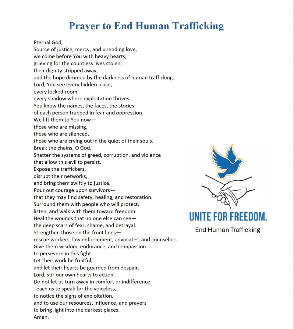 Dio eterno, fonte di giustizia, misericordia e amore infinito, veniamo davanti a Te con il cuore pesante, addolorati per le innumerevoli vite rubate, la loro dignita strappata via e la speranza offuscata dall'oscurità della tratta di esseri umani. Signore, Tu vedi ogni luogo nascosto, ogni stanza chiusa a chiave, ogni ombra dove prospera lo sfruttamento. Tu conosci i nomi, I volti, le storie di ogni personaintrappolata nella paura e nell'oppressione. Li affidiamo a Te ora: coloro che sono scomparsi, coloro che sono stati messi a tacere, coloro che gridano nel silenzio delle loro anime. Spezza le catene, o Dio. Distruggi i sistemi di avidità, corruzione e violenza che permettono a questo male di persistere. Smaschera i trafficanti, smantella le loro reti e assicurali rapidamente alla giustizia. Dona coraggio ai sopravvissuti, affinché possano trovare sicurezza, guarigione e risanamento. Circondali di persone che li proteggano, li ascoltino e li accompagnino verso la libertà. Guarisci le ferite che nessun altro può vedere: le profonde cicatrici della paura, della vergogna e del tradimento. Rafforza coloro che sono in prima linea: soccorritori, forze dell'ordine, difensori e consulenti. Dona loro saggezza, resistenza e compassione per perseverare in questa lotta. Fa' che il loro lavoro sia fruttuoso e che i loro cuori siano protetti dalla disperazione. Signore, spingi i nostri cuori all'azione. Non permettere che ci voltiamo dall'altra parte con indifferenza o per comodità.